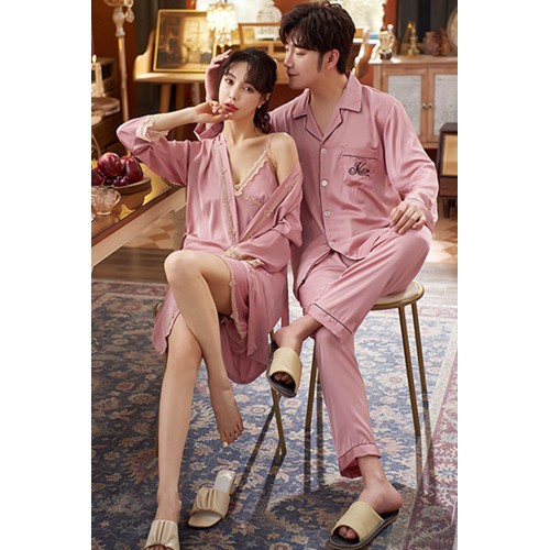 Pink Men Silk Like Long Sleeve Pajamas Set
