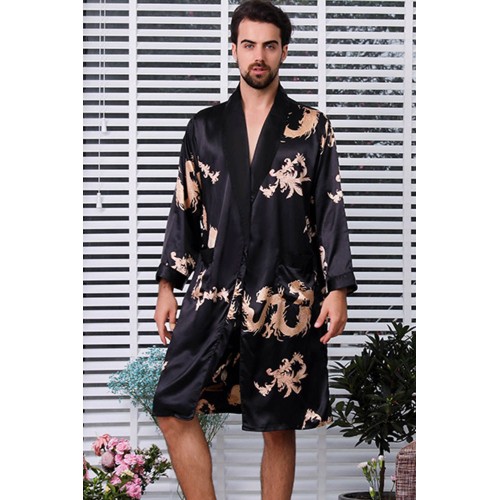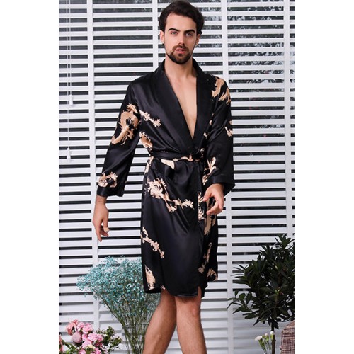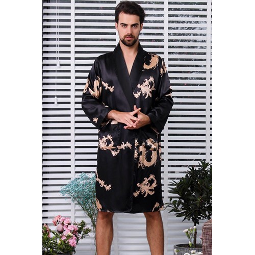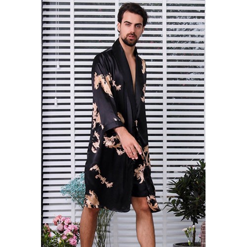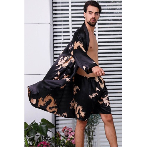 Black Dragon Print Lace-up Men Satin Nightgown