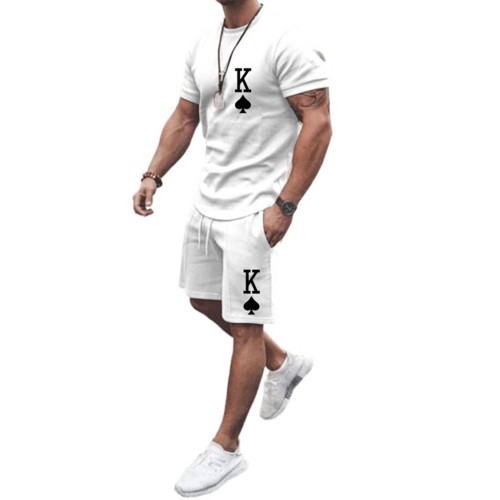 White Men's Poker Letter Print Short Sleeve Top and Shorts Suit