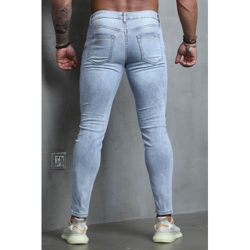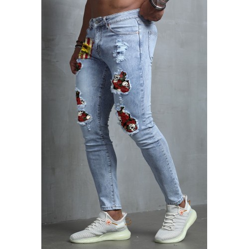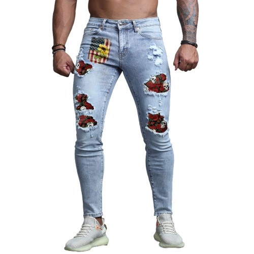 Sky Blue American Flag Floral Skull Print Patchwork Skinny Men's Jeans