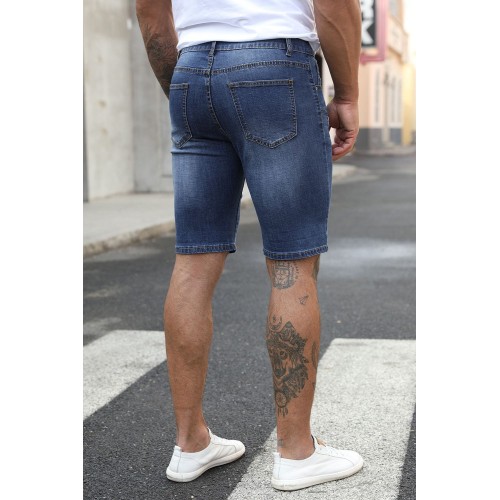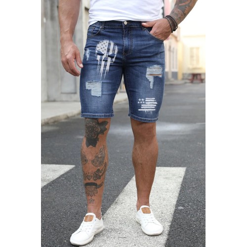 Blue American Flag Skull Print Skinny Distressed Men's Denim Shorts