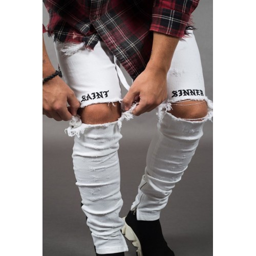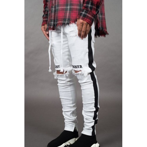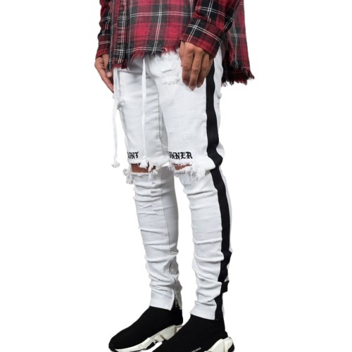 White Letter Striped Print Ripped Slim-fit Men's Jeans