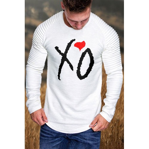 White XO Heart Print Pleated Sleeve Slim-fit Men's T-shirt