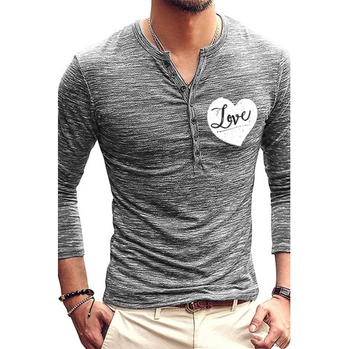 Men's Love Heart Print Buttons Slim-fit Long Sleeve T-shirt