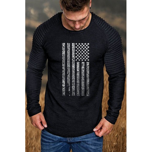 Pleated Long Sleeve Letter US Flag Print Men's Graphic T-shirt