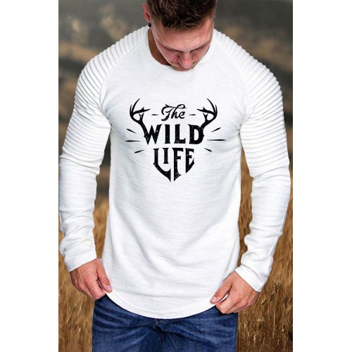 White The Wild Life Graphic Print Pleated Sleeve Men's T-shirt