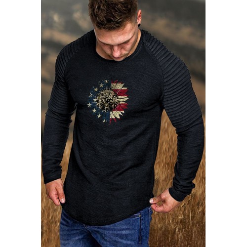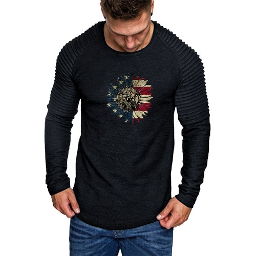 US Flag Sunflower Print Pleated Slim-fit Men's T-shirt