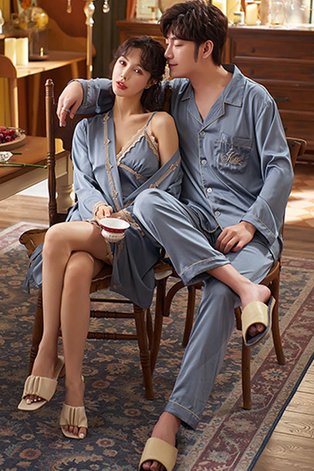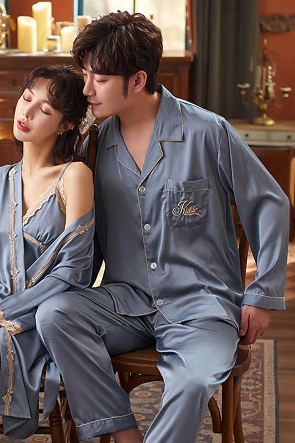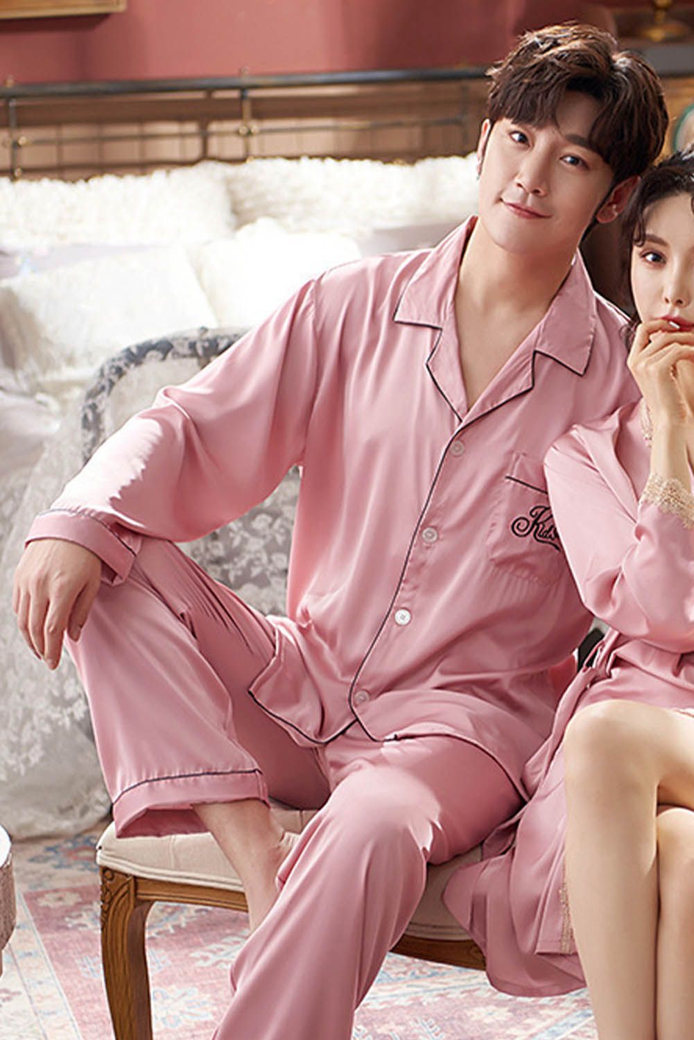 Pink Men Silk Like Long Sleeve Pajamas Set